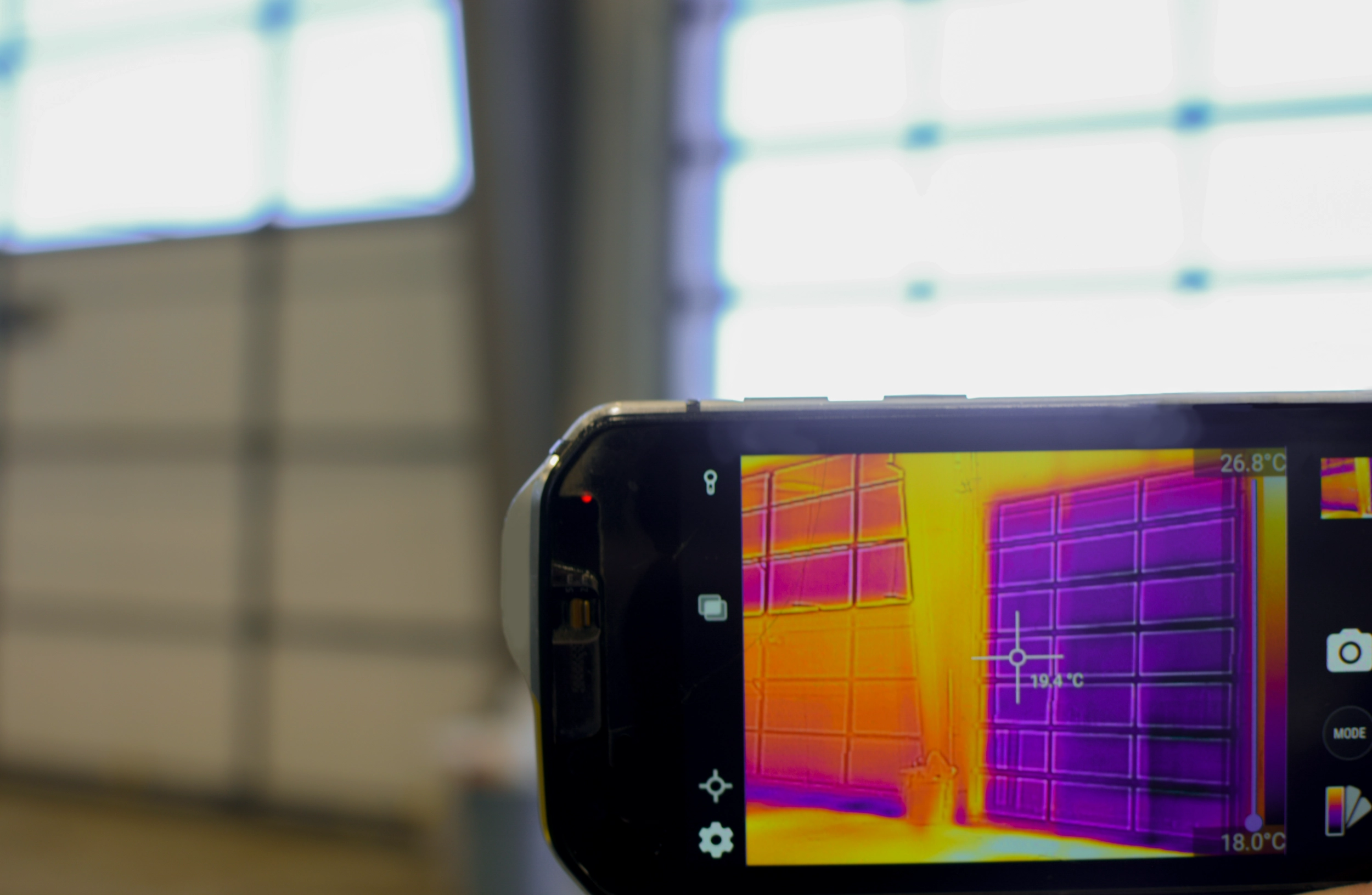 A thermal imaging camera showing the difference in energy efficiency between a bifold door and overhead door.